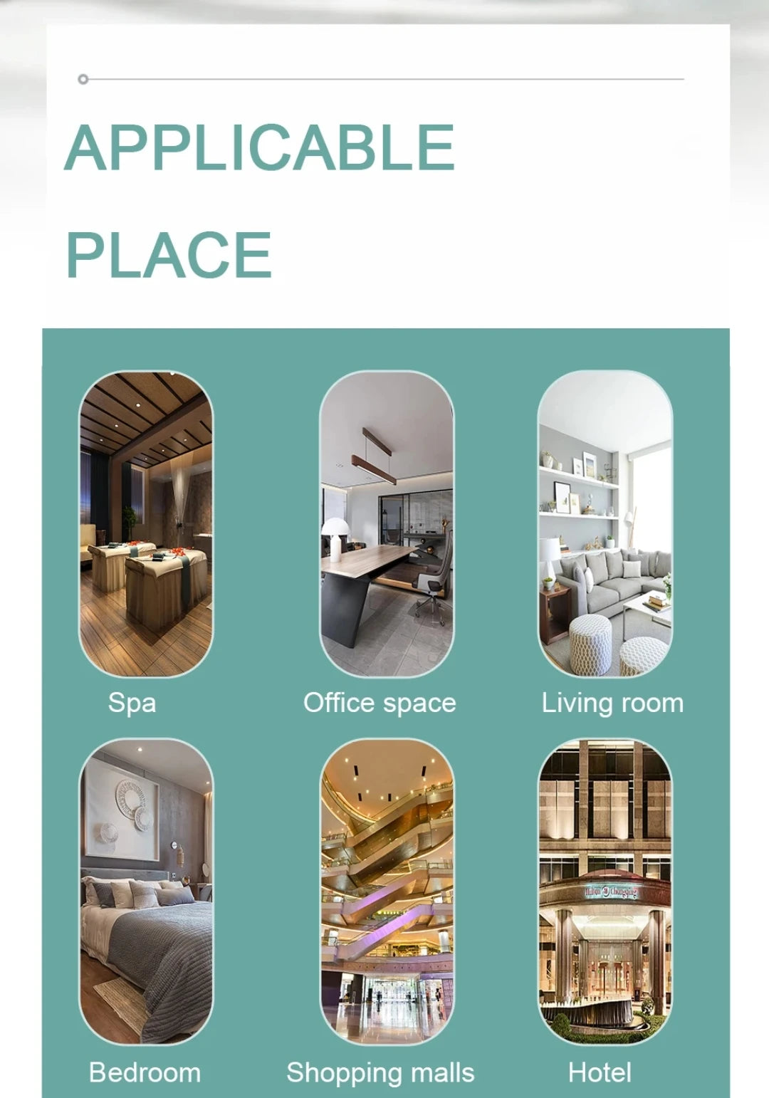 Area of Application: Hotel, KTV, Office Building, Shopping Mall, Exhibi-tion Hall, Beauty Salon, Home, Toilet, Living Room, Bedroom etc.